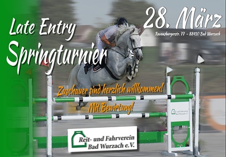 15. Februar. Unser erstes Turnier dieses Jahr findet am 28. März statt. Wir freuen uns auf viele Teilnehmer und Zuschauer zu unserem Late Entry Springturnier. Für das leibliche Wohl wird wieder bestens gesorgt.